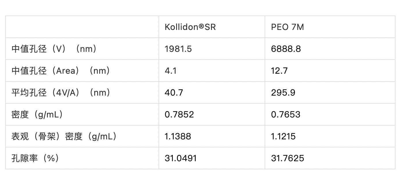 孔隙率和孔徑分布的數據如下圖、表,聚合物的選擇影響了片的孔徑分布。兩種片孔隙率和密度接近,但從孔徑分布可以看出Kollidon?SR處方存在更小的孔。這種差異可能由于兩種聚合物的形貌不同。Kollidon?SR顆粒粒徑更小,結構中空且顆粒表面有溝壑;而PEO 7M粒徑更大、形狀更不規則。