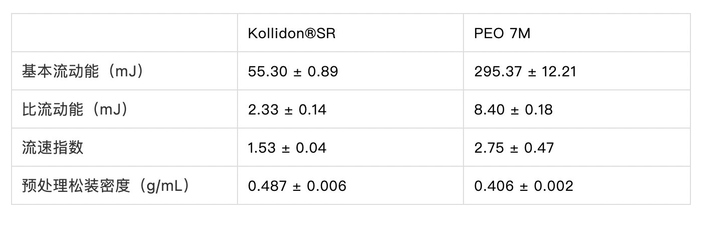 動態測試的結果如下表,Kollidon?SR混合物的基本流動能較小,動態流動時的阻力較小,在強制流動、流入料斗的過程更有優勢。Kollidon?SR混合物的比流動能較小,受機械咬合和摩擦的作用較小,更易于重力下料。PEO 7M混合物的粘性較強,對于流速敏感,更易夾帶氣體,堆積效率較差,并且密度較小。因此,Kollidon?SR混合物壓片時表現更好。