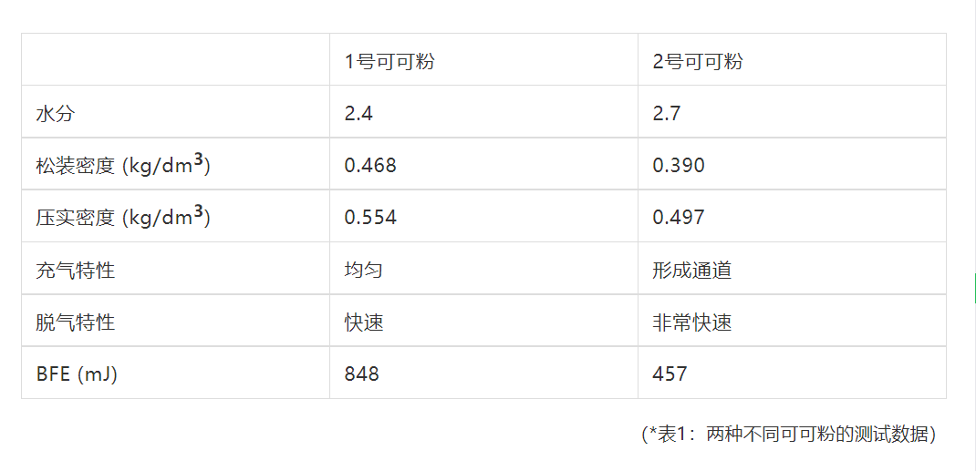 表1顯示了兩種不同可可粉的測試數據,包括水分含量、松裝密度和BFE值。這些數據顯示,雖然它們是“相同”的樣品,但實際上有著顯著差異。1號可可粉具有較大的松裝、壓實密度,也呈現均勻的充氣特性,表明充入空氣后幫助流動。與之相比,2號可可粉在充氣時形成通道,通常與較強的顆粒間作用力相關,同時脫氣也更快。這些特性都與裝填解決方案的選擇密切相關。而2號可可粉的BFE明顯低于1號可可粉,表明該樣品更易于流動。