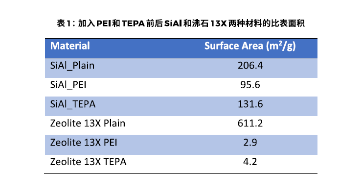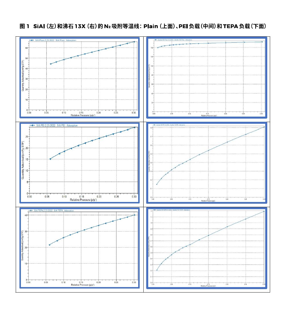 樣品制備: 硅鋁(SiAl_Plain)是Micromeritics的標準樣品,沸石13X_Plain是從Zeochem獲得的樣品。將這兩種材料(各約1.0g)加入分別到溶解了4ml PEI或者TEPA的20ml乙醇中,充分混合后在50°C下干燥12h得到了SiAl_PEI ,13X_PEI,SiAl_TEPA 和13X_TEPA四個樣品。