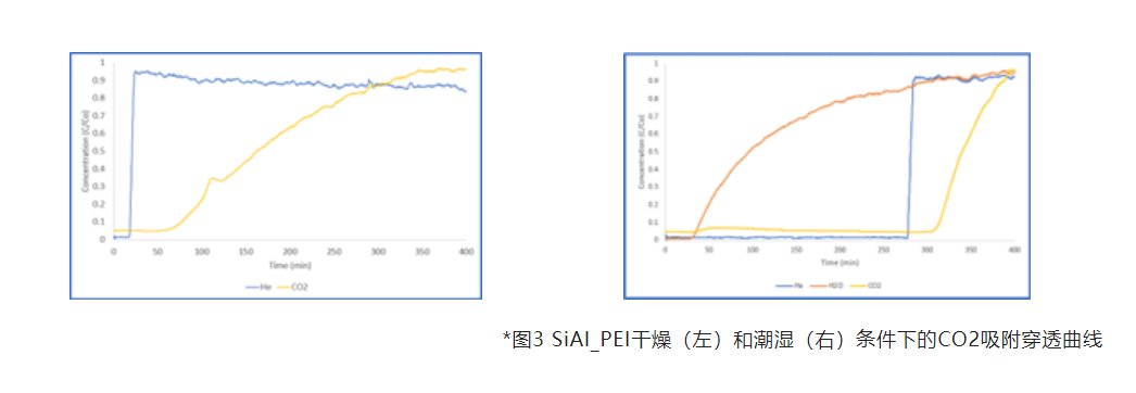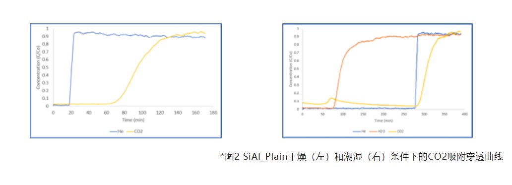 在潮濕和干燥條件下,SiAl_Plain的CO2穿透曲線如圖2所示。左圖中說明CO2的穿透曲線比He標定氣體坡度小,一是因為CO2濃度非常低,二是因為硅鋁(SiAl)顆粒較大導致的一些傳質限制。對比干燥(左)和潮濕(右)兩組結果,我們可以觀察到水的存在導致SiAl_Plain的CO2吸附量顯著下降,這說明CO2和水之間存在競爭吸附。