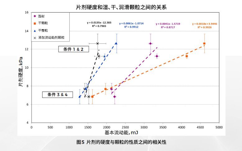 四個(gè)條件下生產(chǎn)的片劑的硬度與干燥顆粒以及磨粉后顆粒的 BFE 數(shù)值間有極好線性相關(guān)性,R2 數(shù)值高0.99(圖5)。與濕粒和潤(rùn)滑顆粒間的線性相關(guān)性稍差,這是由于存在水分或流動(dòng)助劑(硬脂酸鎂)等額外成分的影響。眾所周知,這兩者即便是含量很少,也會(huì)對(duì)粉體的流動(dòng)性質(zhì)產(chǎn)生影響。