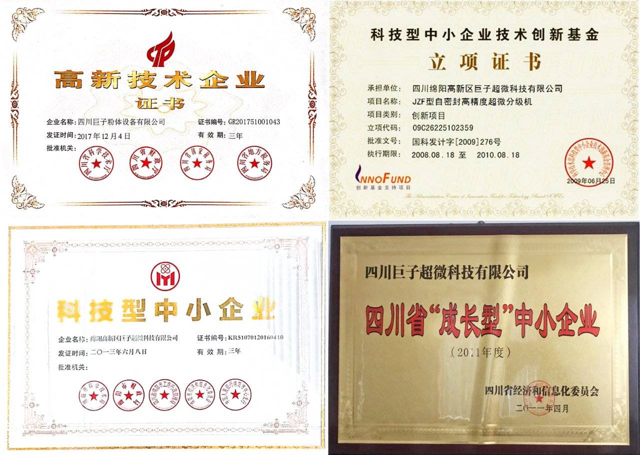 在20年來的發展歷程中巨子公司形成了獨具特色的研發、銷售、生產及售后服務體系,在企業經營、技術研發、文化建設和可持續發展方面成績斐然。公司于2008年順利通過ISO9000質量體系認證,現有的各系列粉碎分級設備能應用于多種領域,可提供上萬種粉體系統工程解決方案;實現了行業的重大突破,為前沿科研用于民用開發探索出了一條新路徑。公司以技術起家,從2006年家被認定為國家高新技術企業后連續順利通過高企復審,并被認定為省市兩級知識產權試點企業、綿陽市重點知識產權保護單位、科技型中小企業,2010年公司自主研發項目 “JZF型自密封高精度超微系列分級機”獲得了國家創新基金立項資助并順利通過驗收。