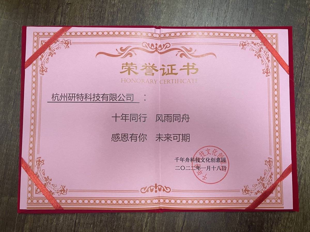 杭州研特科技有限公司于2010年入駐千年舟,十年來,和園區(qū)共奮斗,同進步,倍感光榮。徐總代表本司參與本次頒獎典禮,并且榮獲“十年創(chuàng)業(yè)同行”獎,乘風(fēng)破浪,研特科技愿與園區(qū)共成長。