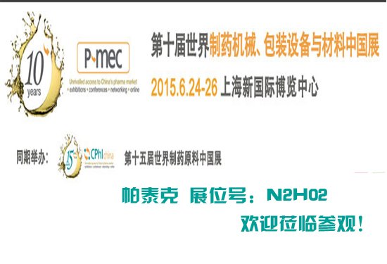"第十屆世界制藥機械、包裝設備與材料中國展"(P-MEC & InnoPack China 2015)將于2015年6月24—26日在上海新國際博覽中心舉行。