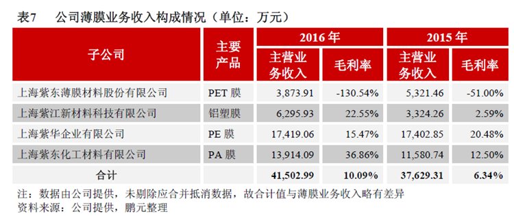 報告顯示,紫江企業的薄膜業務產品包括PET膜、鋁塑膜、PE膜及PA膜,分別由子公司上海紫東薄膜材料股份有限公司、上海紫江新材料科技有限公司、上海紫華企業有限公司、上海紫東化工材料有限公司負責運營。