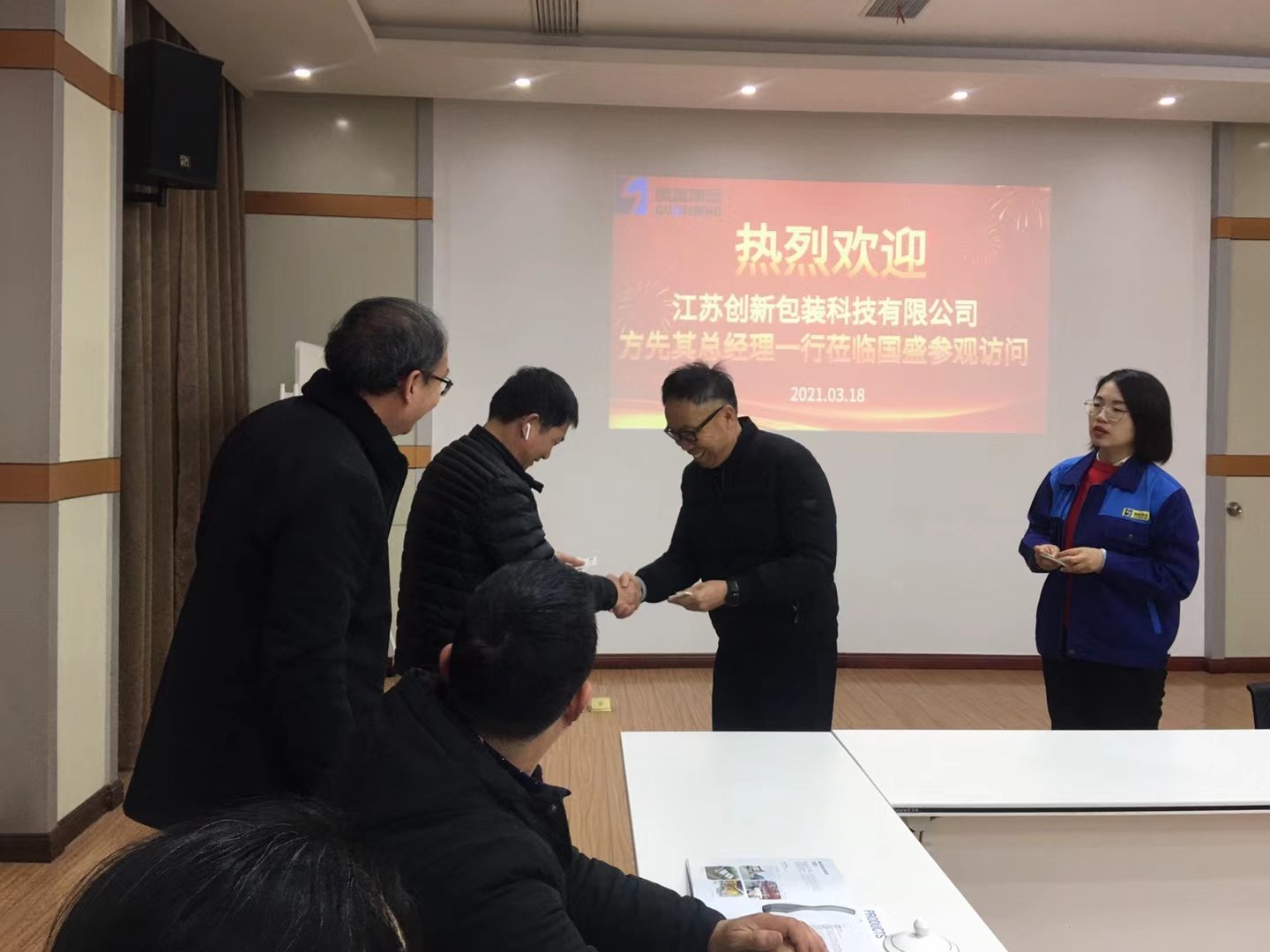 3月18日,江蘇創(chuàng)新包裝科技有限公司董事長方先其先生率領(lǐng)公司管理人員蒞臨南通國盛智能科技集團(tuán)股份有限公司參觀訪問。南通國盛智能科技集團(tuán)股份有限公司潘衛(wèi)國董事長熱情地接待來訪一行。