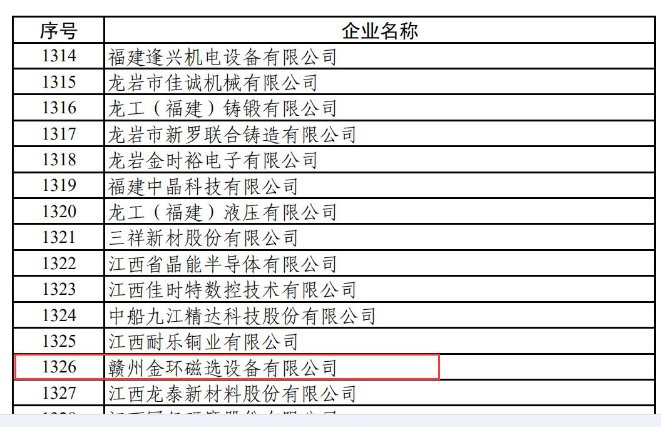 近期,國(guó)家工業(yè)和信息化部公示了第三批國(guó)家專精特新“小巨人”企業(yè)名單,贛州金環(huán)磁選設(shè)備有限公司成功入選,榮獲國(guó)家專精特新“小巨人”企業(yè)稱號(hào)。