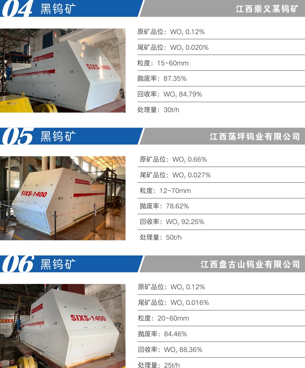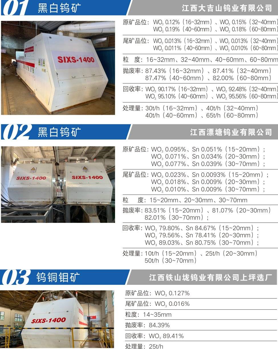 適用于鎢礦、銻礦、錫礦、鉛鋅銀礦、銅礦、金礦、鉬礦等有色金屬、貴金屬、稀有金屬礦以及長石、石英等非金屬的預選拋尾工藝,替代人工手選作業、全磨全選,可大幅提高粗選拋廢率,提高入磨品位,擴大產能,提質增效,降低選礦成本,實現礦山智能化生產。SIXS型裝備可分選10-100mm粒級范圍礦石,最大處理能力達240t/h。主要性能參數見表1。