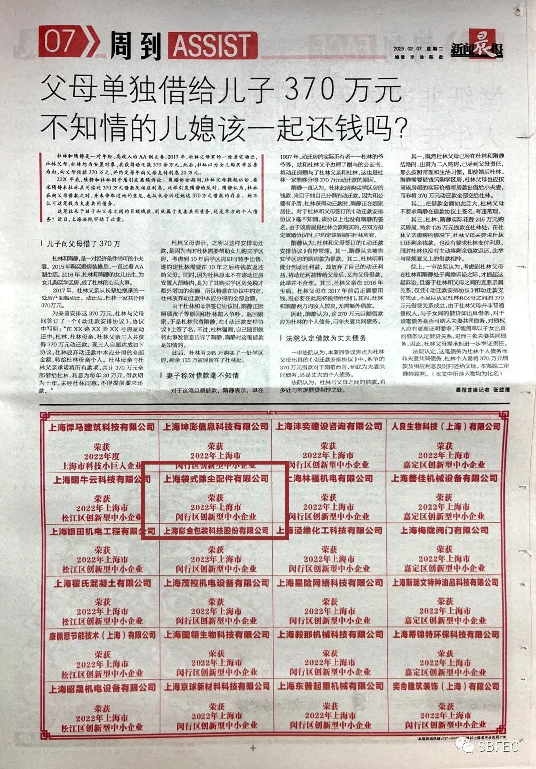 根據《上海市優質中小企業梯度培育管理實施細則》要求,上海市經濟和信息化委員會開展了2022年創新型中小企業評價工作,上海袋式除塵配件有限公司獲此殊榮,并刊登于《新聞晨報》榮譽專欄。