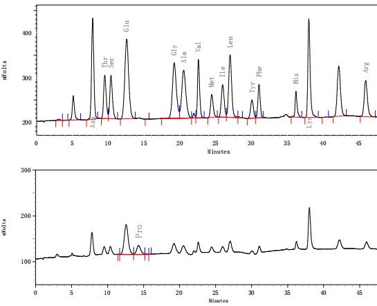 稱取含蛋白7.5-25mg的試樣,加入水解管中,加入15mL 6mol/L鹽酸,繼續向水解管內加入苯酚3滴~4滴。冷凍3min~5min,接到真空泵的抽氣管上,抽真空(接近0Pa),然后充入氮氣,重復抽真空-充入氮氣3次后,在充氮氣狀態下擰緊螺蓋。 將水解管放入干浴水解濃縮儀中,110°C水解22-24h,冷卻、混勻、開管、轉移并定容到50ml容量瓶中,用移液管取適量樣液,在干浴水解濃縮儀中50°C吹干,必要時加入少許水,重復吹干1-2次,加入3-5mL PH2.2的稀釋上機用檸檬酸鈉緩沖液溶解,振蕩混勻后,吸取溶液通過0.22μm 濾膜后,轉移至儀器進樣瓶,為樣品測定液,供儀器測定用。