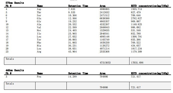 以石斑魚為原料,使用Biochrom30+全自動氨基酸自動分析儀對其肌肉的氨基酸組成進行分析。結果表明石斑魚肌肉中氨基酸總量的質量百分比為17753.114mg/100g,必需氨基酸(不含色氨酸)占氨基酸總量的40.63%,鮮味氨基酸占氨基酸總量的38.52%。