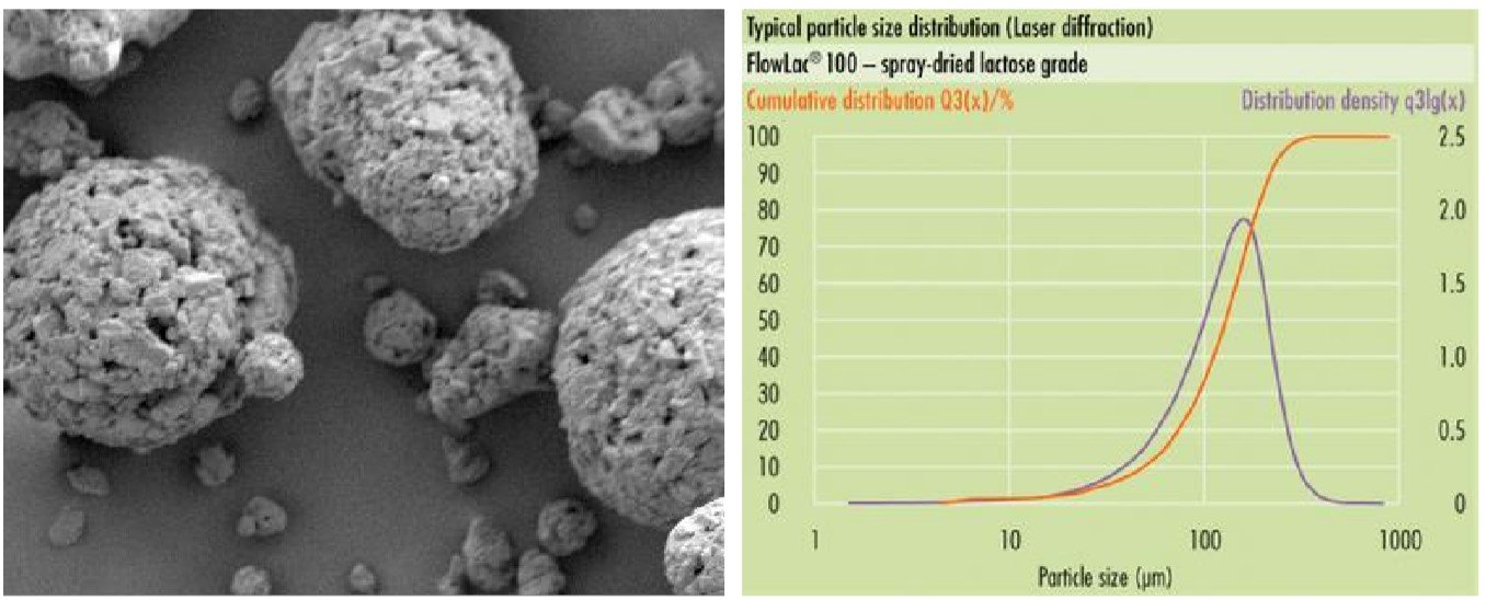 Figure 1: FlowLac 100, SEM Picture and particle size distribution (manufacturer data).
