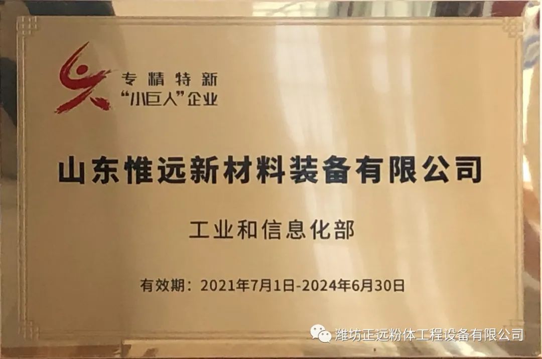 正遠公司的子公司山東惟遠新材料裝備有限公司榮獲國家級《專精特新“小巨人”》企業稱號