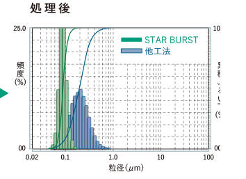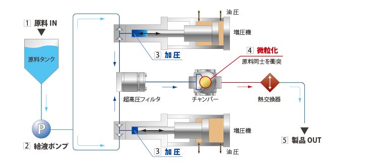 在講原料微粒化的時候,會發(fā)生混入雜質(zhì)和粒子直徑不均勻等阻礙原料功能特性的問題。為了解決這些問題,濕法超高壓分散系統(tǒng)使粒子之間發(fā)生斜向?qū)ψ病_擊,開發(fā)出來使之進(jìn)行純粒子化的劃時代工藝,開拓了一個新的微粒化世界。