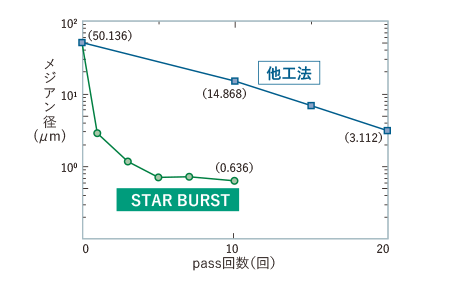 超高壓分散系統(tǒng)提供的碰撞力比氣流磨更大,可以使物料粒徑減小,通過次數(shù)減少。而且產(chǎn)品的粒度分布變得尖銳并且產(chǎn)率提高。系統(tǒng)裝置中殘留原料的量減少,產(chǎn)品的回收率提高。除此之外,系統(tǒng)還可以有效改善物料如鈦酸鋇的潤濕性,使其在分散時的分散性增加。
