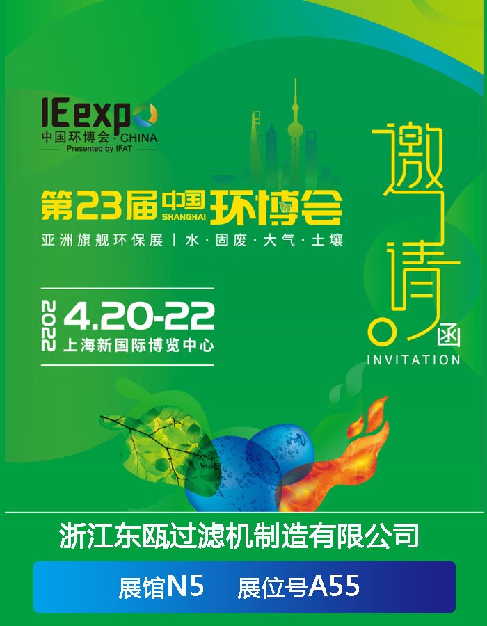 4月20-22日,亞洲旗艦環(huán)保展將在上海新國(guó)際博覽中心舉行,浙江東甌過(guò)濾機(jī)制造有限公司在這里恭候您的光臨(東甌展位:展館N5展位號(hào)A55)。