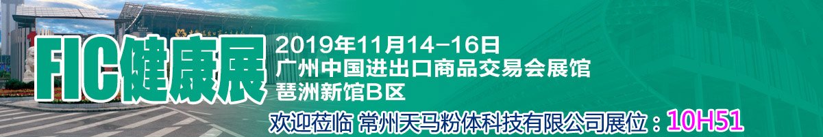 2019年11月14~16日,首屆中國國際天然提取物和健康食品配料展覽會(FIC健康展)、第十九屆全國秋季食品添加劑和配料展覽會(FIC秋季展)將在廣州中國進出口商品交易會琶洲展館隆重舉辦。常州天馬粉體科技有限公司期待行業同仁屆時光臨,展位:10H51。