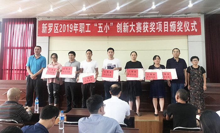 2019年10月14日,龍巖市新羅區2019年職工“五小”創新大賽獲獎項目頒獎儀式上,龍巖市山和機械制造有限公司的一種納米鈣解聚工藝及裝置項目、高效排渣的干式粉碎盤項目同時斬獲三等獎。我司辦公室張主任出席并登臺領獎。