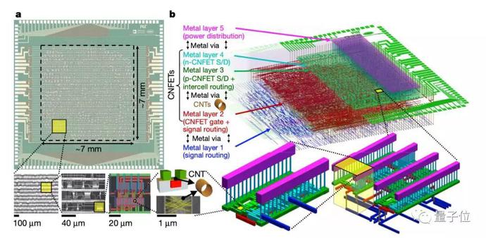 RV16X-NANO也是一個3D芯片,納米管層下面的金屬觸點用于在不同晶體管之間傳遞信號,而而納米管上方的單獨金屬觸點用于供電。