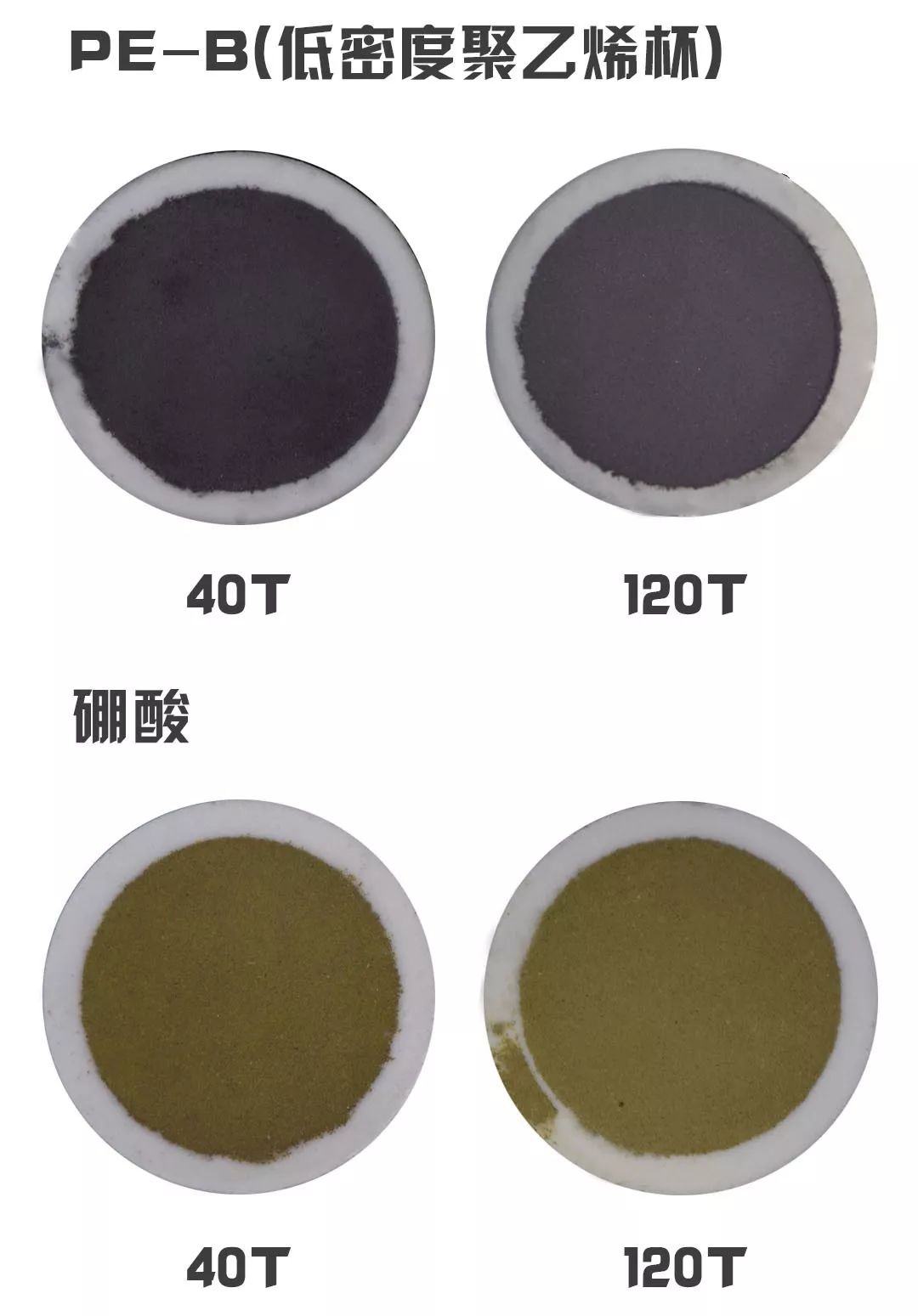 由于硼酸和低密度聚乙烯的物性上差別很大(見表一),導致二者制樣時差別明顯: