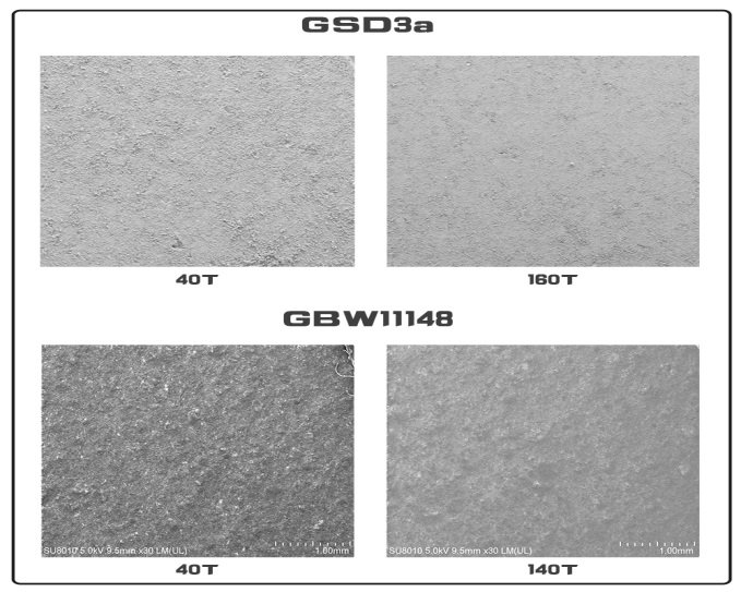 為了檢查試樣表面的形態(tài)和致密度,通過(guò)使用掃描電子顯微鏡對(duì)不同壓力制備的試樣拍照,見下圖[1,2],隨著壓力的增大,樣片的厚度減小,密度增大, 表面光潔度增加,背景散射減小。