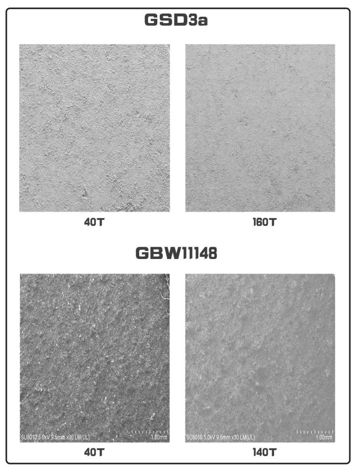 為了檢查試樣表面的形態(tài)和致密度,通過使用掃描電子顯微鏡對不同壓力制備的試樣拍照,見下圖[1,2],隨著壓力的增大,樣片的厚度減小,密度增大, 表面光潔度增加,背景散射減小。