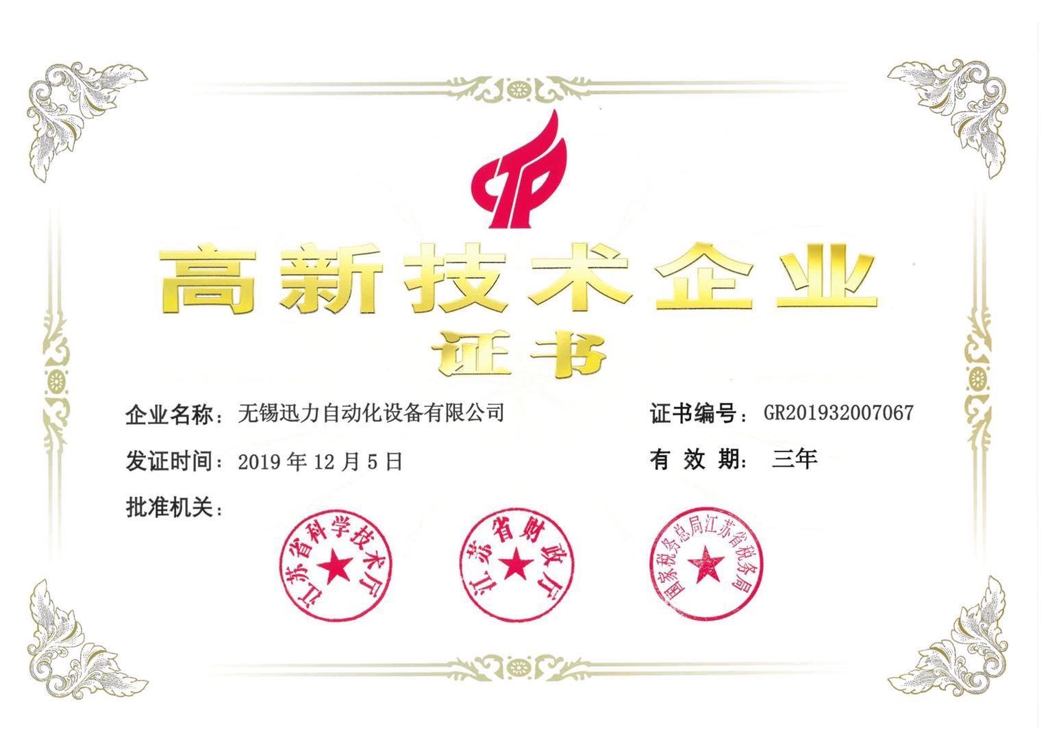 恭喜無(wú)錫迅力自動(dòng)化設(shè)備有限公司正式成為高新技術(shù)企業(yè)!