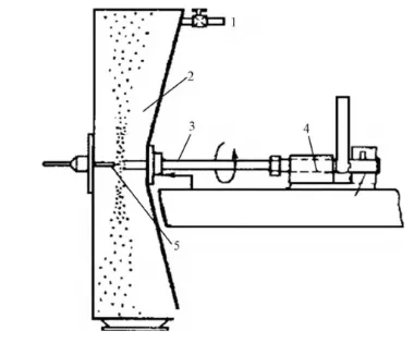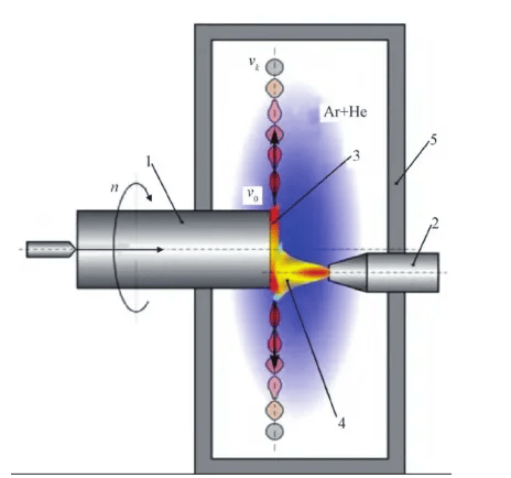 1-棒料;2-等離子發(fā)生器;3-液態(tài)金屬膜;4-等離子火焰;5-濺射室