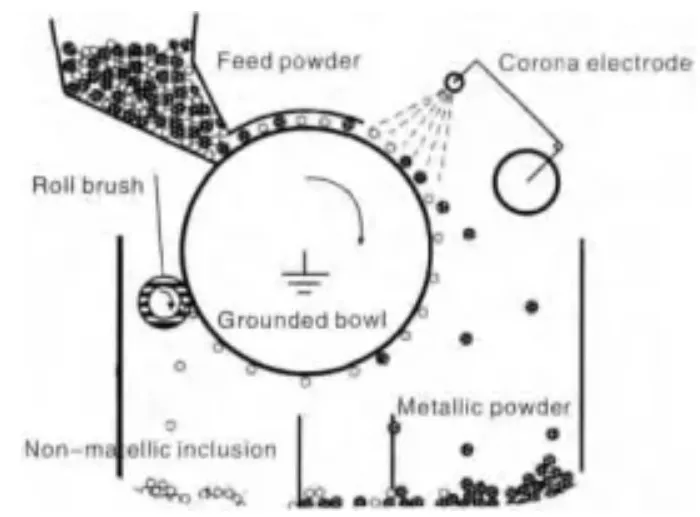 電選分離技術(shù)是去除粉末中非金屬夾雜物的關(guān)鍵技術(shù),其原理是通過(guò)電暈放電現(xiàn)象使粉末顆粒帶電,然后利用金屬粉末和非金屬夾雜物之間電性能的不同進(jìn)行分離。圖6為高壓靜電分離原理的示意圖。
