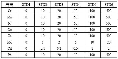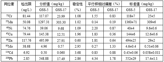采用ICP-MS2000E電感耦合等離子體質譜儀測定土壤標準物質中Cr、Mn、Ni、Cu、Zn、Mo、Cd、Pb八種金屬元素含量,檢出限在2.85-117.76 ng/L之間,穩定性在0.60%-3.68% 之間,各元素測試結果與標準值相符,能夠滿足第三次全國土壤普查中關于電感耦合等離子體質譜法檢測上述各元素的要求。
