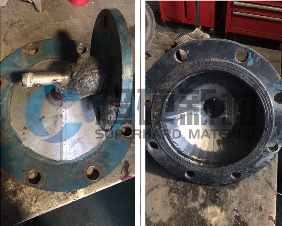 發(fā)送倉(cāng)牛角彎噴涂碳化鎢三個(gè)月即磨損,換陶瓷內(nèi)襯后一年多無(wú)明顯磨損