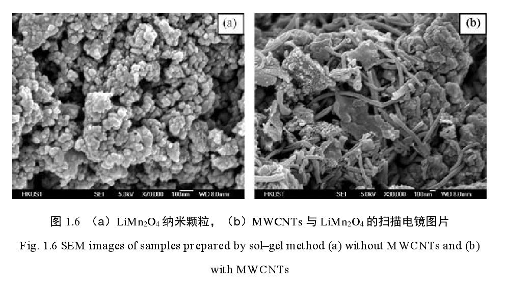 Liu 等合成了 MWCNTs 與 Li Mn2O4 納米顆粒的復合電極材料,在掃描電鏡下(圖 1.6)可以看到 MWCNTs
