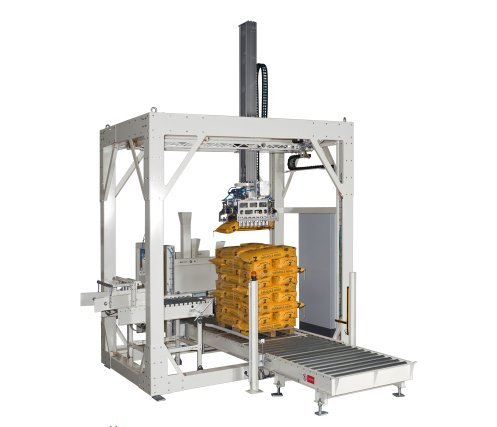 抓取裝置在其垂直軸上旋轉,根據編程的層形成打開并準確地將袋子放在托盤上。