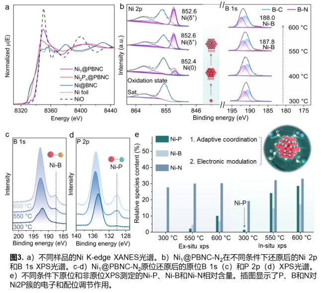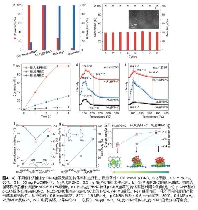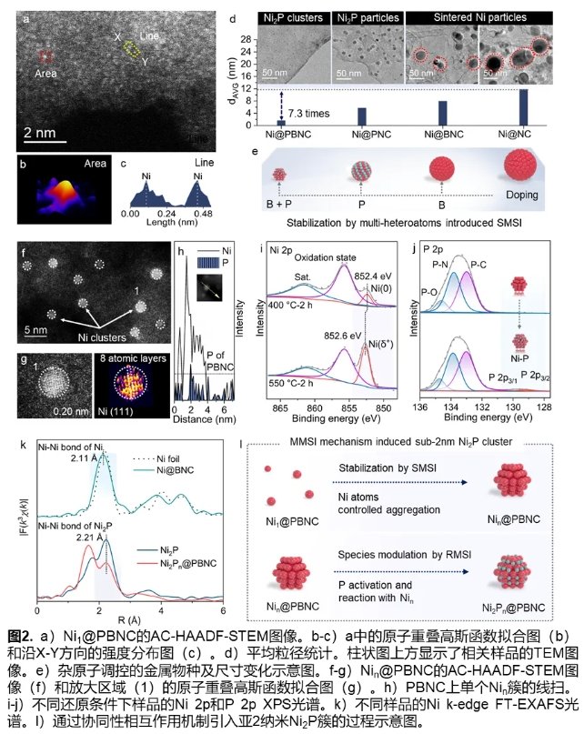 本文提出將 SMSI 與反應性金屬-載體相互作用 (RMSI) 協同作用來克服上述挑戰。綜合表征證實,SMSI 能穩定金屬在亞 2 納米范圍內,并調節 Ni1 可控聚集到 Nin 位點。同時,RMSI 通過充分激活載體中的 P 來調節 Nin,并最終生成亞 2 納米的金屬磷化物 Ni2P簇(Ni2Pn)。金屬與載體之間的協同作用引發了Ni2Pn的自適應配位和電子結構優化,從而實現了理想的底物吸附-解吸動力學。因此,Ni2Pn 在對氯硝基苯和炔醇的選擇性氫化方面的活性大大提高。目標產物的形成率分別是 Ni1 和 Nin 位點的 20.2 倍和 3.0 倍。這項工作可能會為金屬-載體相互作用開辟一個新方向,并促進 3 納米以下活性位點的創新和應用。