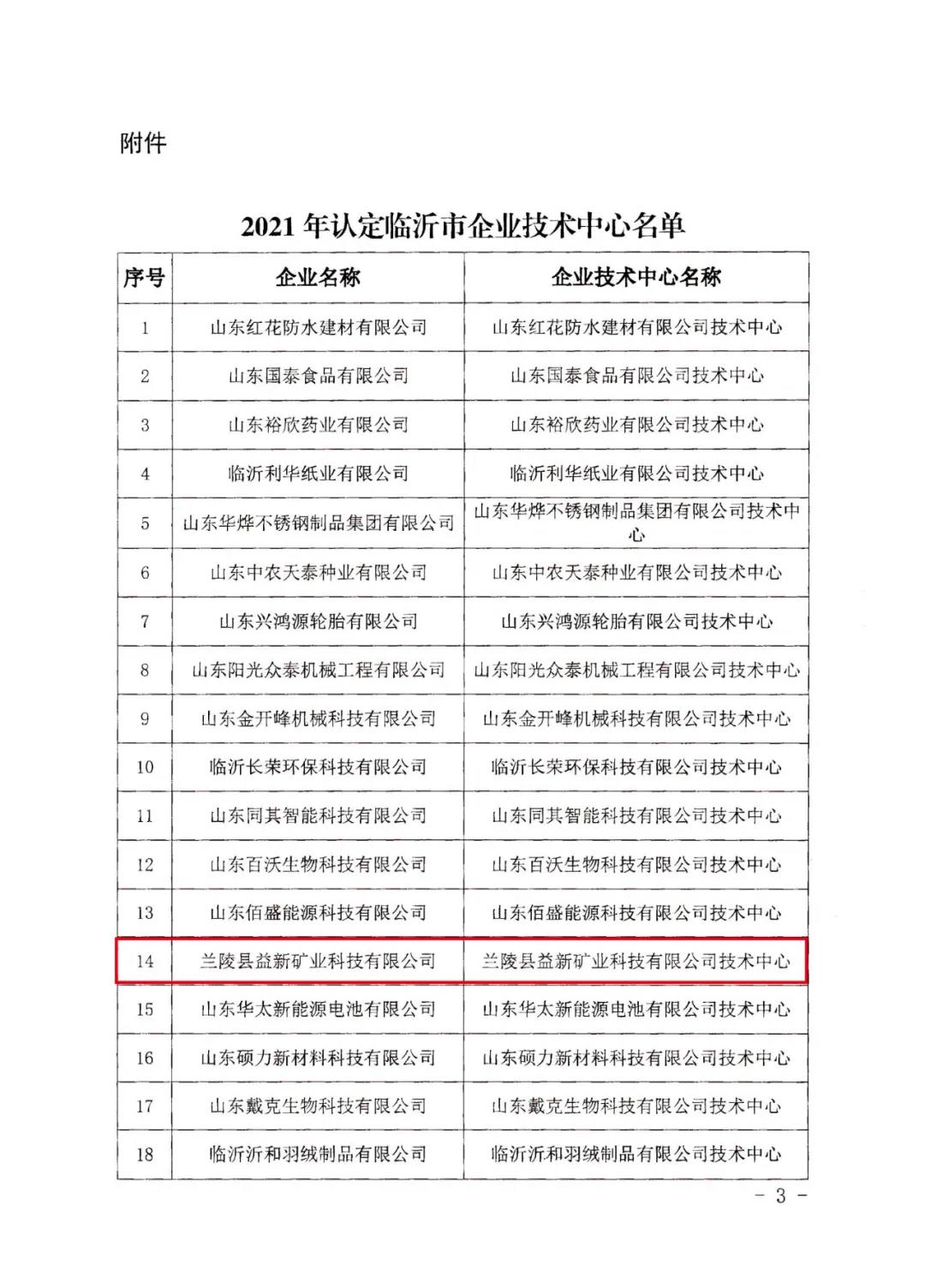 臨沂市發展和改革委員會公布了2021年認定臨沂市企業技術中心名單,蘭陵縣益新礦業科技有限公司上榜了!!!