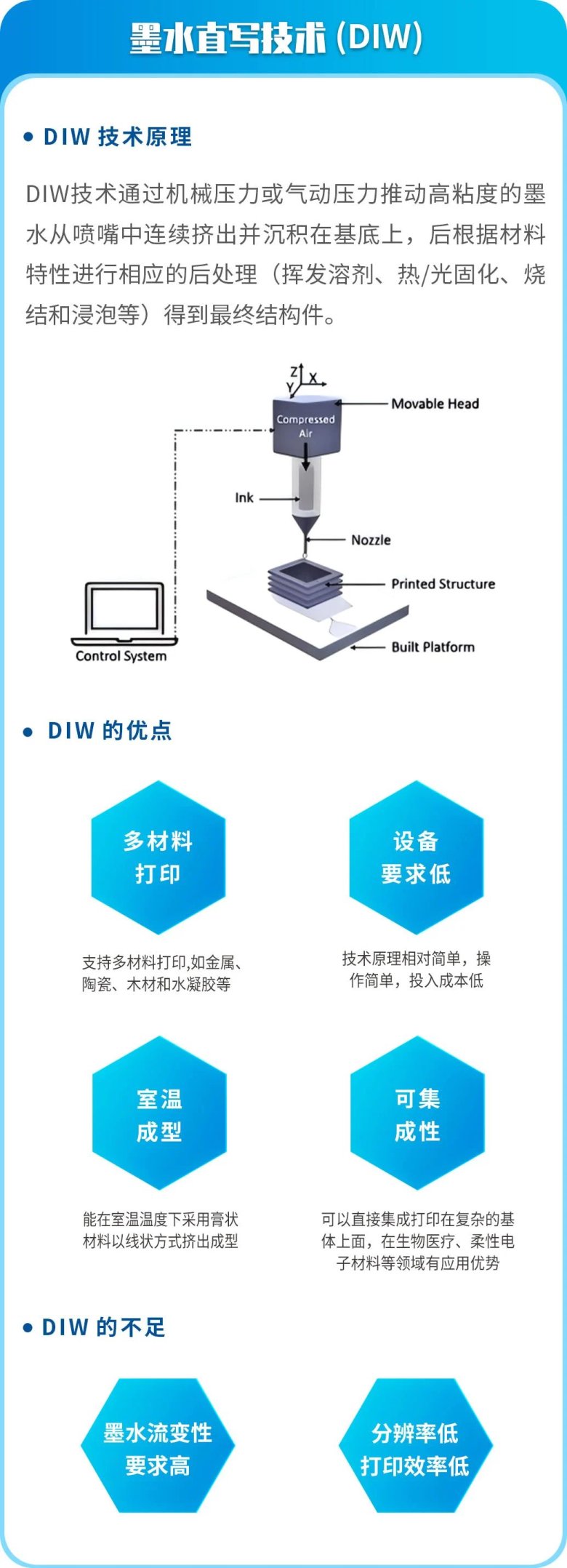 墨水直寫3D打印技術,也稱直接墨水書寫(Direct Ink Writing,DIW),源于1998年美國Sandia國家實驗室J.Cesarano等提出的自動注漿成型技術,起初主要針對陶瓷等材料的三維模型制造,這得益于陶瓷粉體密度低、易與相關溶劑形成均勻穩定的懸浮漿料,從而和這種擠出式技術的原理特點相得益彰,因此有關陶瓷類漿料直寫技術的研究在國內外一直屬于熱點領域。不過隨著直寫技術的不斷發展成熟,也逐漸有研究將該技術擴展到其他材料,例如金屬粉末材料、生物凝膠材料。