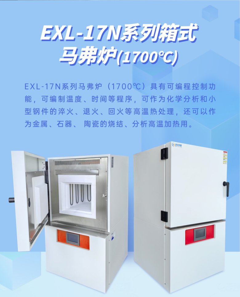 EXL-17N系列馬弗爐(1700℃)具有可編程控制功能,可編制溫度、時間等程序, 可作為化學分析和小型鋼件的淬火、退火、回火等高溫熱處理,還可以作 為金屬、石器、陶瓷的燒結、分析高溫加熱用。