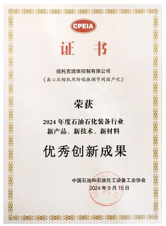 大會同期遴選、發布了2024年度中國石油石化裝備行業“新產品、新技術、新材料"科技創新成果榜單,紐托克離心壓縮機用防喘振調節閥榮獲”優秀科技創新成果”,卓劍平董事長上臺領獎。