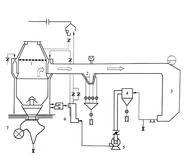 1-干熄爐;2-1DC(一次除塵器);3-鍋爐;4-2DC(二次除塵器);5—循環風機;6—給